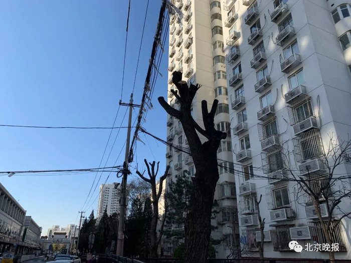 无独有偶,因影响采光被剪秃的还有朝阳区的安慧北里小区里的大片杨树。一进小区大门,记者就看到两棵被砍得只剩1米多高的大树。再往小区里走,道路两旁、休闲广场上、居民楼下,随处可见主干以上全部被砍掉的大树。在小区8号楼旁,还有一棵近5层楼高的松树,枝干全部被砍,仅剩如同电线杆般的主干。