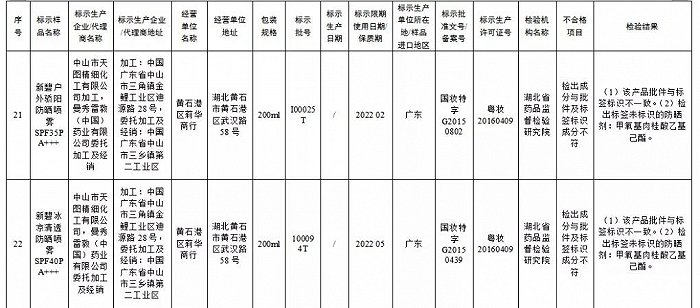 2019年12月26日,国家药监局发布《关于27批次不合格化妆品的通告》显示,曼秀雷敦委托其他公司加工的新碧户外骄阳防晒喷雾SPF35PA+++(标示批号I00025T)、新碧冰凉清透防晒喷雾SPF40PA+++(标示批号100094T)两批次产品,被检出批件与标签标识不一致,且检出标签未标识的防晒剂甲氧基肉桂酸乙基己酯。