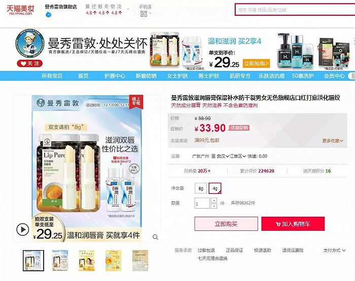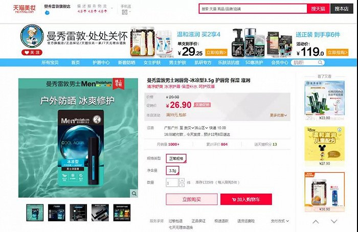 青眼在曼秀雷敦天猫旗舰店上看到,曼秀雷敦男士润唇膏SPF15-冰凉型的产品为正常销售状态,该产品的月销量为1000件。据悉,这款唇膏即宣称具有防晒功效。