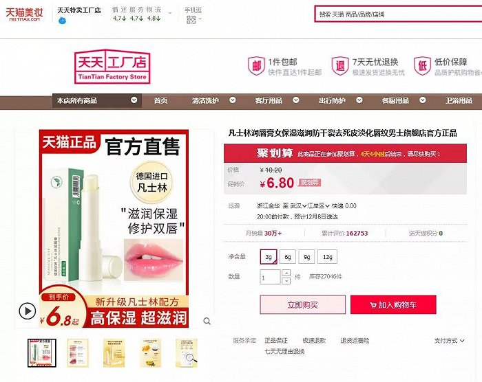 青眼以“润唇膏”为关键词在天猫上搜索共显示超过了1.4万件相关产品,其中,排名第一的是健美创研凡士林润唇膏;排名第二的是曼秀雷敦天然植物润唇膏套装(无香料),前者的月销量超过了30万件,后者的销量超过了20万件。