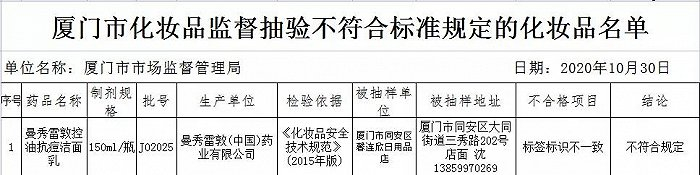 2020年10月30日,厦门市市场监督管理局发布2020年第1期化妆品监督抽检信息显示,标称为曼秀雷敦(中国)公司生产,厦门市同安区馨连欣日用品店销售的规格为150ml/瓶的曼秀雷敦控油抗痘洁面乳(批号J02025),因标签标识不一致,不符合规定。