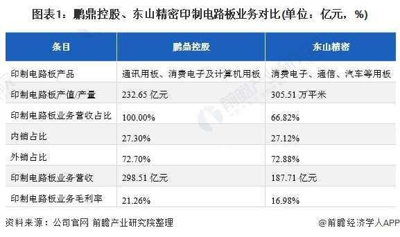 印制电路板(PCB),又称印刷线路板,是重要的电子部件,是电子元器件的支撑体,是电子元器件电气连接的载体。目前,我国印制电路板领先主要有鹏鼎控股(002938)和东山精密(002384),两家企业的印制电路板业务情况对比如下: