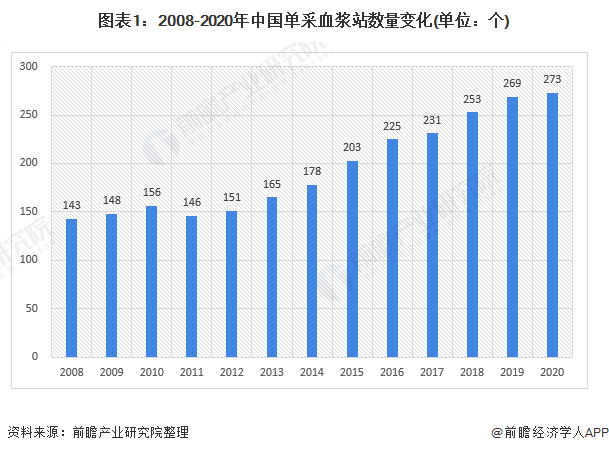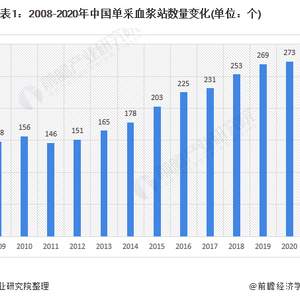 监管部门的严厉整治使浆站数量锐减,2000年我国血浆站有240个,2001年急剧下降为180个;2011年,贵州省卫生厅发布《贵州省采供血机构设置规划(2011-2014)》,拟关停16个血浆站,使血浆站数量下降至146个;2012年华兰生物重庆站、河南站等相继建设,使血浆站数量上升至151家;2014年,华兰生物于9月23日滑县单采血浆站获到采血许可证,沃森生物魏县和栾城建设完成,使血浆站血浆达到178家。2008-2020年我国单采血浆站整体呈增长态势,2020年达到273个,同比增长率仅为1.5%。