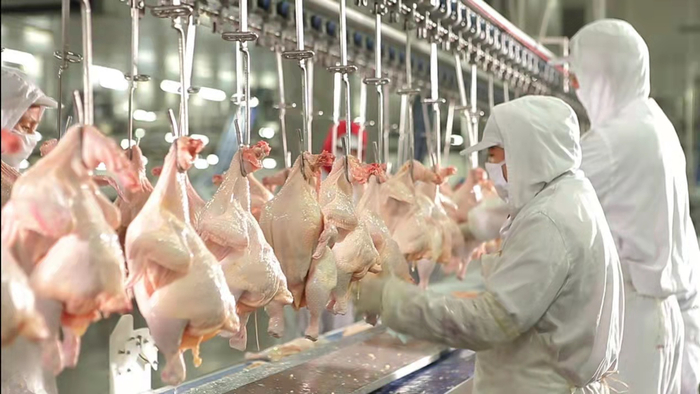 “在分割车间,一只鸡可以分割成108个部位。”路则通说,泰森鸡肉分割线分为前区和后区,在前区,一只完整的鸡要经历上挂、电麻、宰杀放血、浸烫脱毛、掏膛冲淋等步骤,才可以被送至预冷间等待被分割。