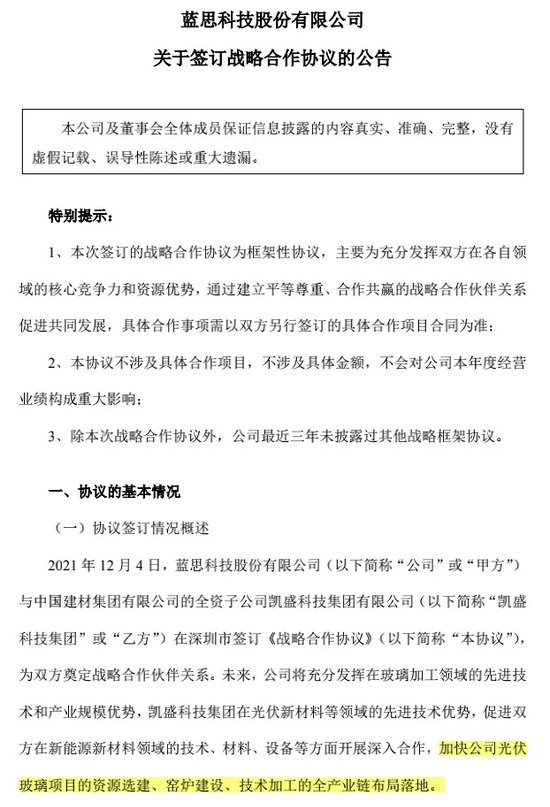 蓝思科技表示,根据协议,凯盛科技集团将加大对新技术和新工艺的研发投入,进一步保证公司光伏玻璃窑炉在行业内的技术先进性,提供EPC工程总承包服务,有利于加快公司光伏玻璃项目的资源选建、窑炉建设、技术加工的全产业链布局落地。同时,公司还将根据相关业务的发展阶段和发展情况,与凯盛科技集团在上游原料和新材料等方面开展合作。