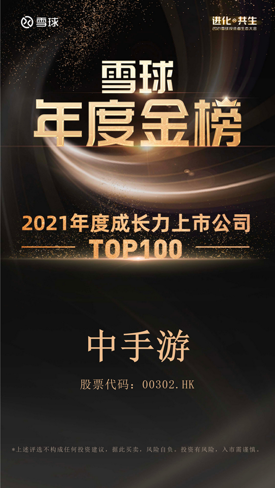 中手游获评雪球“2021年度成长力上市公司TOP100”