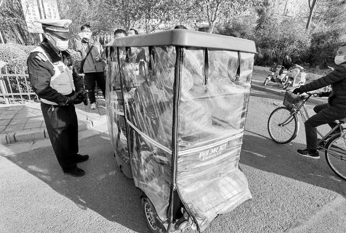 12月7日清晨7时,裕华交警大队一中队在建设大街与南二环交叉口开展电动车交通违法专项治理行动。8时30分,一辆后车厢满载着鞋盒的电动三轮车由南向北驶来。该车明显经过加长、加宽,一中队中队长米文志将该车拦停后,发现该车为了“多拉快跑”,不但在后车厢装满货物,甚至座位上也放了三个纸箱,驾驶人则跟货物挤在一起,晃晃悠悠前行。