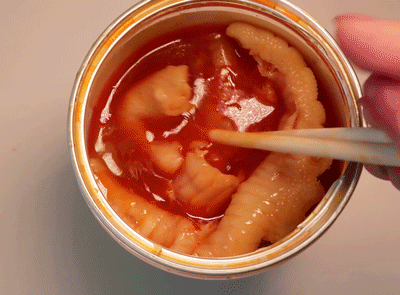 再经过调料浸泡后,才制成我们现在看到的鲜香四溢、弹牙爽口的无骨凤爪。