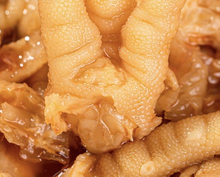 我们精选掌大肉多、肉质饱满的优质鸡爪为原料,需要经过人工去甲、手工脱骨、卤制入味。
