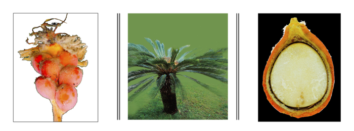 图1. 苏铁长有种子的可育大孢子叶、雌性植株和纵剖种子苏铁类植物之所以能经历上亿年的地质与气候变化,从远古顺利繁衍至今,作为繁殖和散布器官的种子起到了极为重要的作用。苏铁的种子较大,内含丰富的胚乳,胚乳中具有大量油脂和淀粉等营养物质,可为胚的进一步发育及小苗的早期生长提供充足的营养。