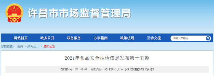 中国质量新闻网讯 12月7日,河南省许昌市市场监管局网站发布2021年第十五期食品安全抽检信息。