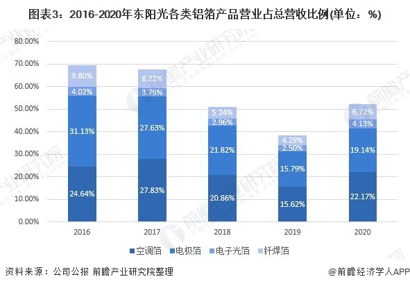 公司铝箔产品主要为铝电解电容器用电极箔(包含腐蚀箔和化成箔)以及合金材料中的电子箔、亲水箔、钎焊箔。从2016-2020年公司铝箔产品营收占公司总营收的比例来看,空调箔和电极箔是公司的主要产品,2020年空调被、电极箔、电子光箔、钎焊箔的营收占比分别为22.17%、19.14%、4.13%、6.72%。