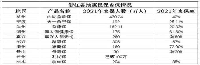 值得关注的是,浙江省政府接连发文,大力推动惠民保发展,并将其视为建设共同富裕示范区的重要部署之一,极大推动了参保率的提升。其中,浙江绍兴“越惠保”、衢州“惠衢保”、嘉兴“大病无忧”等多款产品首年参保率均保持在60%以上。