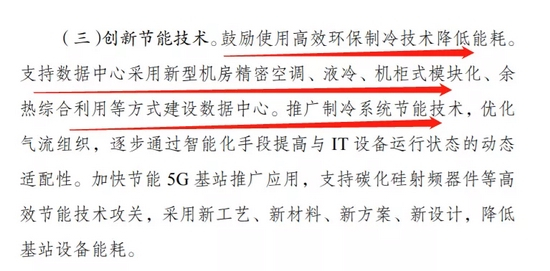 在创新节能技术方面,《方案》鼓励使用高效环保制冷技术降低能耗。支持数据中心采用新型机房精密空调、液冷、机柜式模块化、余热综合利用等方式建设数据中心。推广制冷系统节能技术,优化气流组织,逐步通过智能化手段提高与IT设备运行状态的动态适配性。