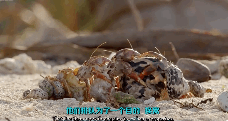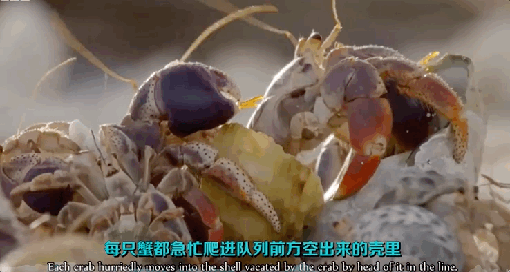 之后,一项伟大的继承仪式开始了。最大的蟹搬进新的大房子里,它空出来的二手房便留给下一位,依次类推。