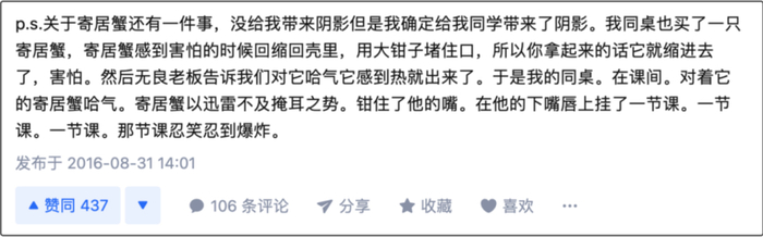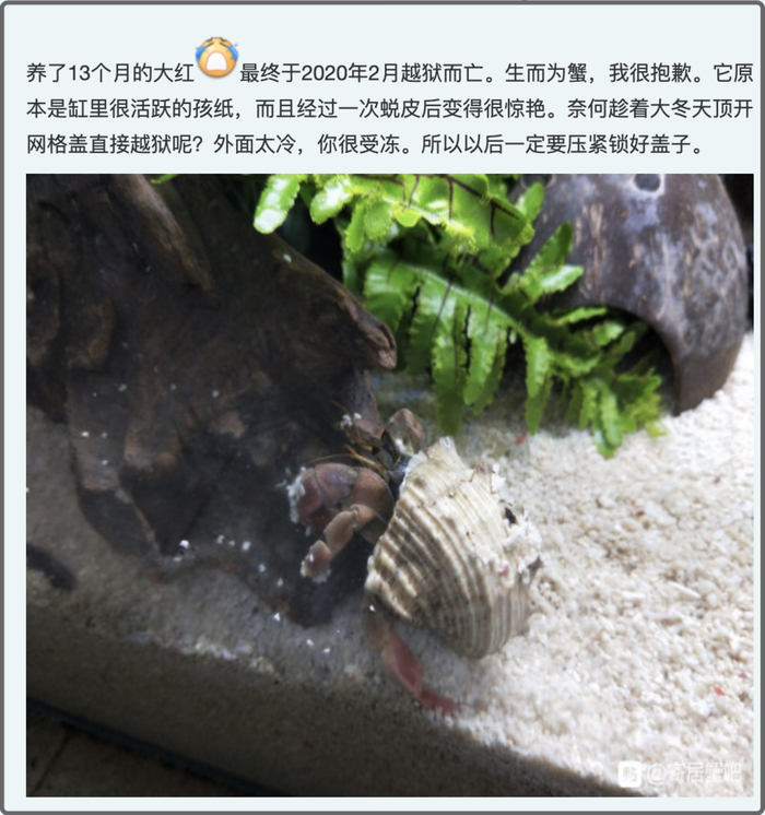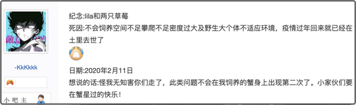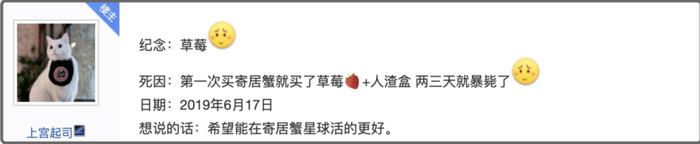 百度寄居蟹吧更是为寄居蟹开辟了一片墓园,曾经的主人们在这里带着自责、悔恨、无奈、忏悔的心情在这里写下悼词,纪念他们死去的爱蟹。