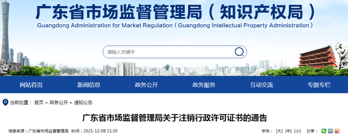 原标题:广东省市场监督管理局关于注销行政许可证书的通告 2021年第236号 来源:中国质量新闻网