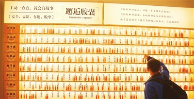 近日,记者来到 “脱单便利店”探访。走进店内,看到占据了一整面墙的“邂逅胶囊”,旁边摆放着供顾客填写信息的桌椅,内部整体以暖色调为主。“主动一点点,就会有故事,安全、靠谱、有趣、脱单。有时候世界很大,可能一辈子都无法相遇;有时候世界很小,小的种种缘分让我们相识,而‘邂逅胶囊’就是为彼此拉近距离,让我们相识。”墙壁上“邂逅胶囊”脱单宣言这样写道。