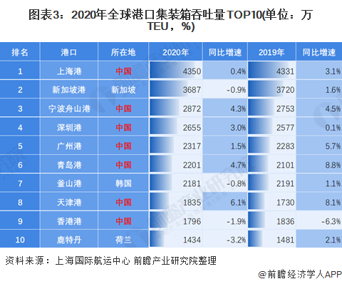 2020年,新冠肺炎疫情迅速在全球范围内蔓延,对港口的生产运营造成一定影响。从2020年全球港口集装箱吞吐量排名上看,2020年,全球港口集装箱吞吐量TOP20集装箱吞吐量达35627万TEU,全球二十大集装箱港口的吞吐量比2019年增长了0.7%。其中天津港2020年集装箱吞吐量达到1835万TEU,同比2019年增长了4.7%,在排在2020年全球港口集装箱吞吐量的第八位。