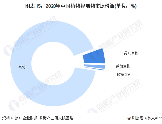 由于植物提取物细分产品多样,应用领域广泛,部分细分领域出现龙头企业,如世界最大辣椒红素生产商晨光生物,业内企业多基于自身业务纵向产业链布局,故即便是植提业务竞争力较强企业,其市占率也较低,加之业内大部分为中小型规模企业,整体市场集中度极为分散。前瞻根据营收统计口径测算,得出2020年晨光生物为中国植提业务市场市占率排名第一的企业,其次为莱茵生物、欧康医药。