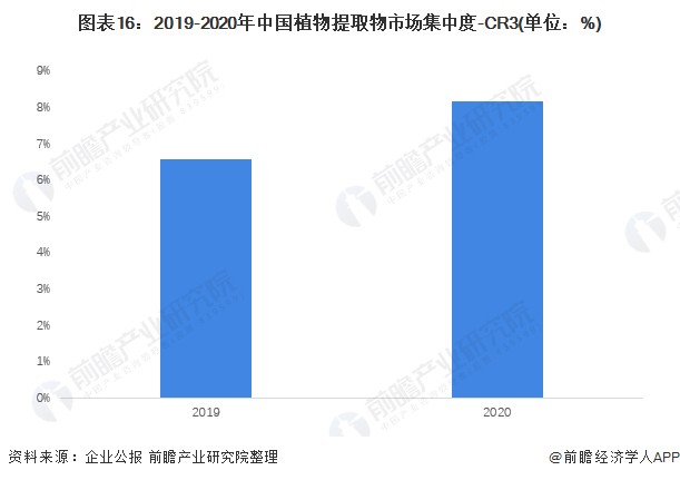 基于上述行业市场份额分析市场集中度情况,得到2019-2020年中国植物提取物行业市场集中度有所上升,CR3由6.58%上升至8.16%,头部企业竞争优势有所增强。