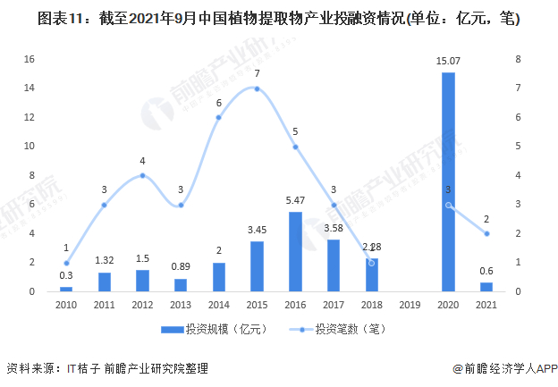 IT桔子数据显示,截至2021年9月,中国的植物提取产业投融资笔数先升后降,投资规模则呈现波动上升趋势,2020年产业投资规模达到15.07亿元,达到近十年来峰值。
