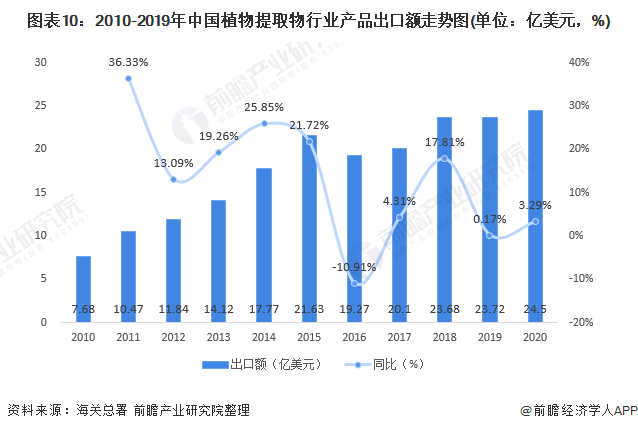 2010-2020年我国植物提取物行业出口额呈波动增长态势。其中,2010-2015年处于行业出口增长高速发展期;2015年以后,出口增速有所放缓,但仍旧保持增长势头。2019年,我国植物提取物行业出口额达23.72亿美元,同比增长0.2%。2020年,我国植物提取物出口总额24.5亿美元,同比增长3.29%。