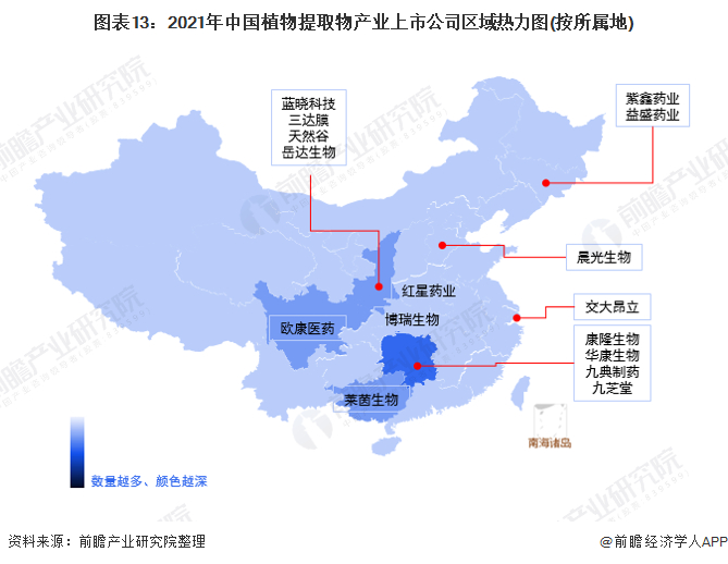 植物提取一般以农业劳动密集型农产品作为原料,经过高新技术的加工,提取健康食品和药用的原料,广泛应用于药品、化妆品、保健品和食品饮料等生产领域,故行业全产业链的地区分布范围极广。