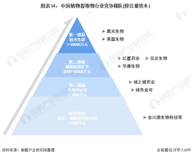 我国植物提取物企业大体上可分为四个梯队,第一梯队包括莱茵生物、晨光生物等A股上市公司,技术先进、规模较大、知名度高;第二梯队包括部分新三板挂牌公司,如岳达生物等,有一定知名度、规模持续扩大;第三梯队包括绿色金可、骄王股份等受到业内认可的企业,其余是相对弱势的第四梯队企业。