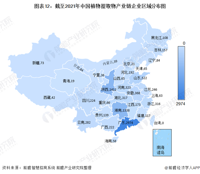 截至2021年我国植物提取物注册企业主要分布于广东、陕西和湖南,该区域植物提取物相关企业数量分别为2974家、1412家和1338家。其次为山东省,分布数量为522家。