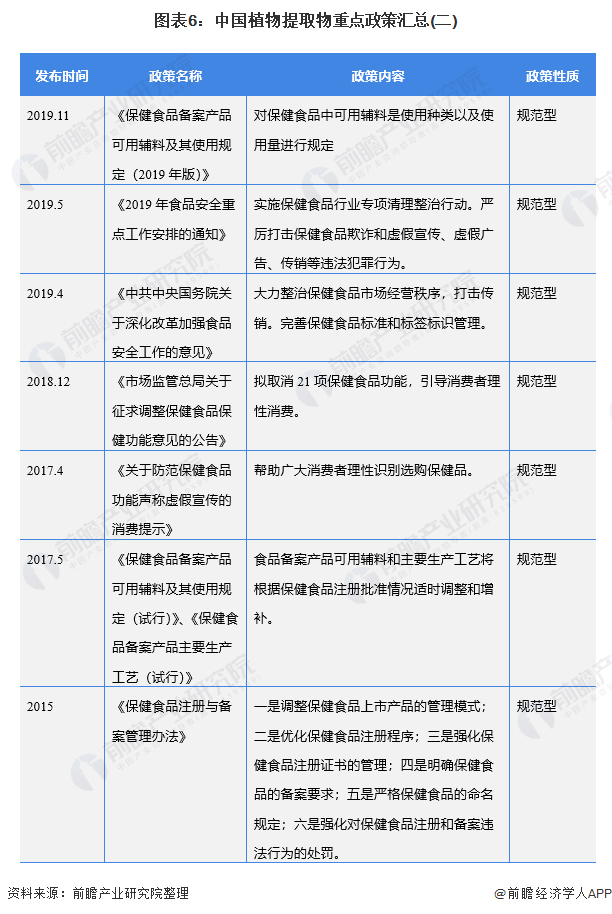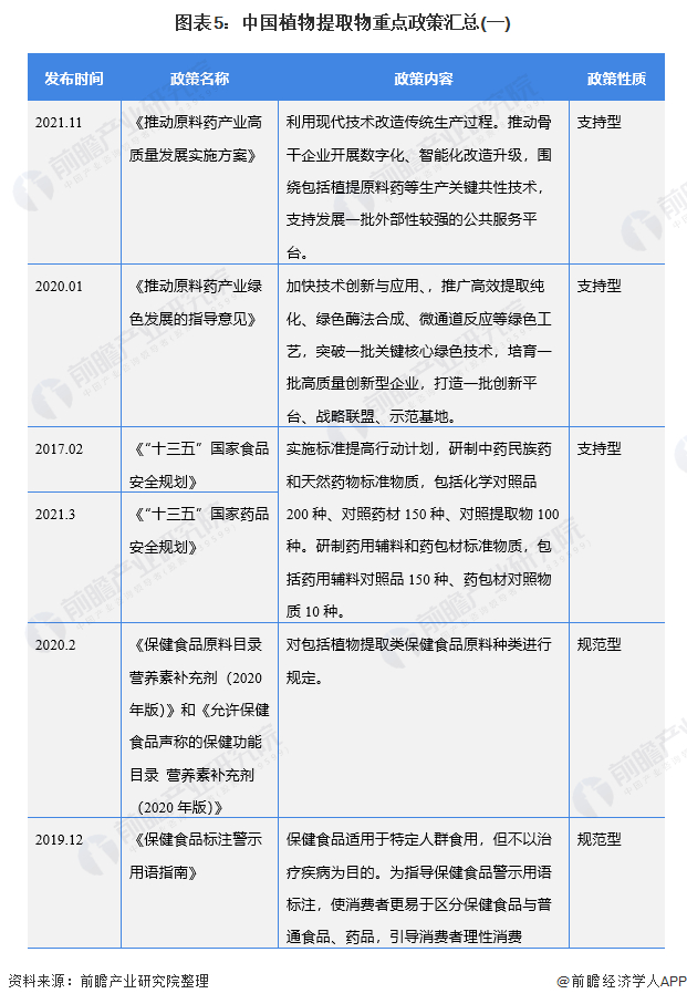 植物提取物作为大健康产品原料,被广泛应用于保健食品、原料药等与公众营养健康息息相关的行业,近年来,出于提升国民身体素质的目的,国家政府针对保健食品、原料药品等领域出台了多项政策,也促进植提行业的规范发展。