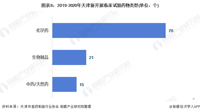 同时,化学药是近几年新药增加数量最多的药品,同时也是临床开发的热点。从新开展临床试验的药物类型来看,化学药、生物制品和中药/天然药物数量分别为70个、21个和15个。总体来看,天津新开展临床试验的药品创新性较高。