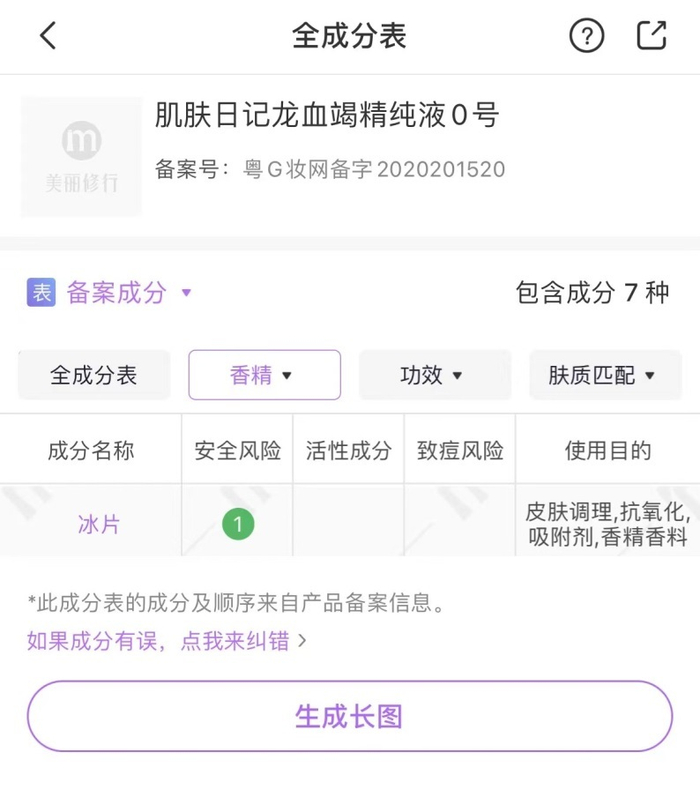 值得注意的是,肌肤日记官网宣传自己“无激素、无香精、无刺激、无抗生素”。但,“肌肤日记龙血竭精纯液0号”的成分表中赫然存在“冰片”这一物质。