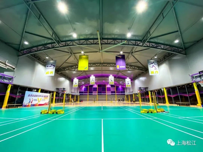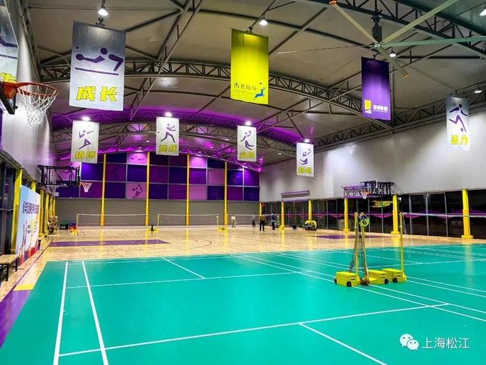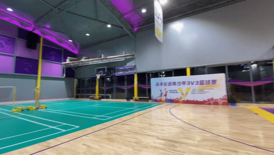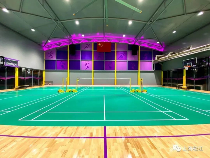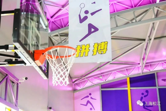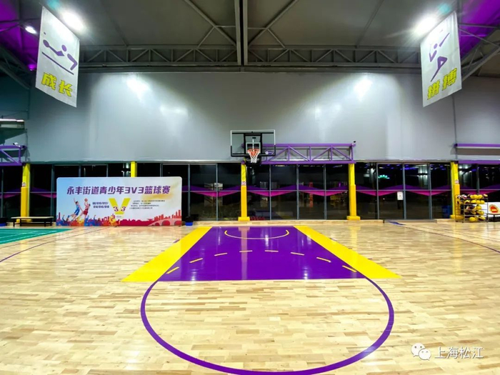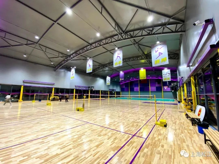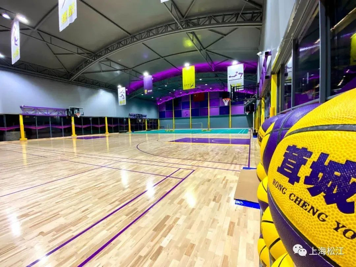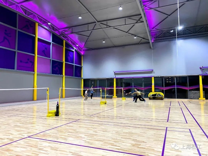 后方则是面积为1000平方米左右的篮球和羽毛球馆。整个场馆以紫色为主色调。中央为篮球场,两侧则设置成羽毛球场。工作人员表示,遇到赛事时,两侧的羽毛球场地的地垫可以卷起来,整个球场恢复成比赛场地。工作日17点多,就陆续开始有运动爱好者来这里打球。
