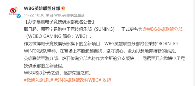 危机之下,俱乐部受到的影响首当其冲。尽管为江苏赢下了历史上首个顶级联赛冠军,但苏宁足球队还是在今年2月宣告停止运营,意甲的国际米兰俱乐部也不断有传出收购传闻。SN电子竞技俱乐部同样是从年初开始有出售传闻流出,直到11月23日正式官宣被微博收购,更名为WBG。