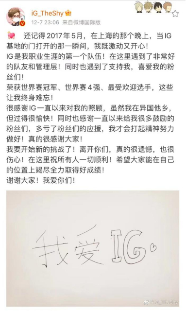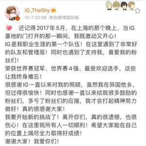昨晚,英雄联盟IG战队正式官宣上单选手The Shy告别队伍,在The Shy的微博里,他写下这样一段话。尽管他是一名韩国选手,但在2019年微博之夜年度人物榜单上,他位列第八,人气甚至超过了许多国内的流量明星。IG是他出道以来待过的唯一队伍,也是第一个为中国大陆赛区在这项赛事上夺得冠军的队伍。