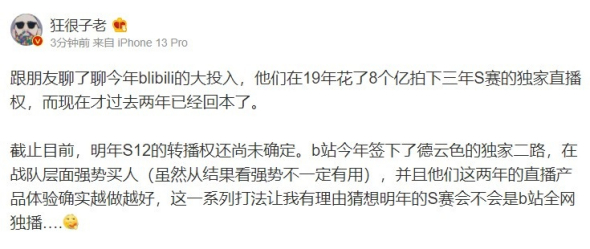 但与传统企业投资电竞不同,B站本身作为互联网平台型公司,在俱乐部的流量变现方面能有更多的方式,某种程度上,这也是他们加大投资的底气所在。3年8亿的S赛独播版权,据业内人士爆料,B站2年就过去就已经回本了。
