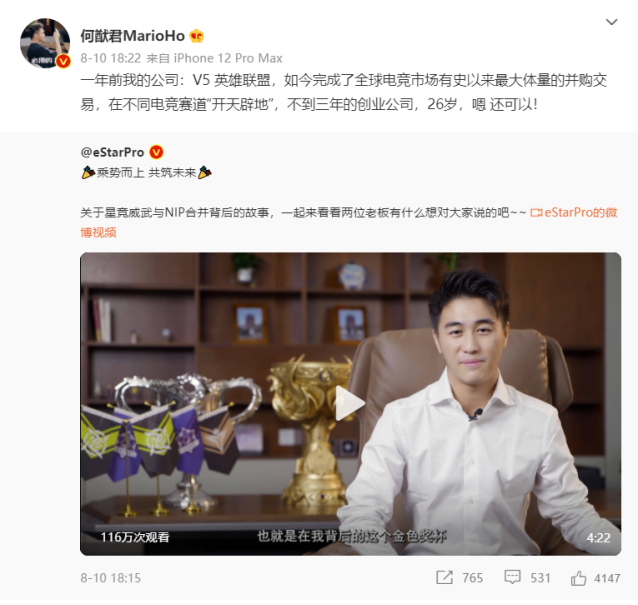 另一个典型样本来自澳门赌王之子何猷君。身为澳门电子竞技总会会长的他,同时也是LPL俱乐部V5的幕后老板。何猷君先是在2020年收购了eStar,成立星竞威武公司,随后又与瑞典电竞俱乐部NIP合并,成立新实体星威忍者集团,并谋求在美股上市,成为“国内电竞第一股”。
