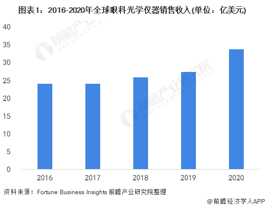 随着全球范围内老龄化现象的加剧,白内障、青光眼、干眼等眼疾越来越常见,全球眼科光学仪器市场前景广阔。结合全球眼科医疗器械规模及眼科光学仪器占比,2020年,全球眼科光学仪器的销售收入超过30亿美元,2020年增长较快的原因主要在于眼科医疗器械占比的大幅提升。