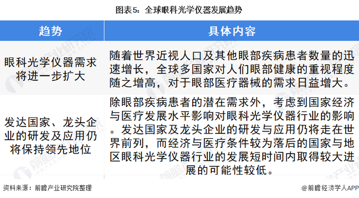 全球眼科光学仪器的发展主要受眼科光学仪器的需求及实际研发等影响。从需求层面来看,随着世界近视人口及其他眼部疾病患者人数的增长,眼科光学仪器的需求将保持增长状态。从供给层面来看,受国家经济及医疗发展水平影响,经济与医疗条件较为落后的国家和地区眼科光学仪器短期取得较大进展的可能性较低。