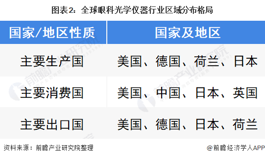 从全球眼科光学仪器行业的生产国来看,美国、日本、德国为主要生产国;从主要消费国来看,美国、中国和日本为主要消费国;从主要出口国来看,以美国、德国、日本和荷兰为主。