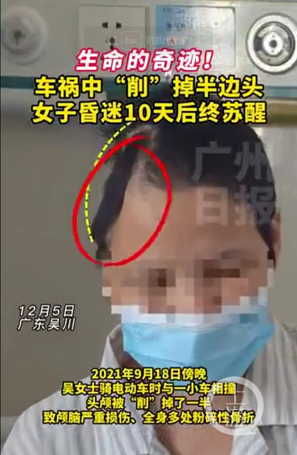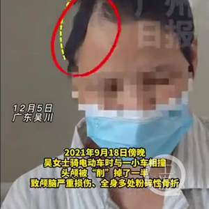 邓永兵还指出了一个细节:“在上热搜的微博中,我们看到对患者李女士的描述是‘2021年9月18日,广东吴川市塘缀镇的李女士骑电动车外出时,不幸与一小车相撞,头颅被削掉了一半,致颅脑严重损伤、全身多处粉碎性骨折’。很多网友都被这种描述吓到了,特别是那张李女士术后拍的头部凹了进去、少了将近1/3的照片。实际上李女士头部的凹陷,应该不是车祸直接造成的,而是做开颅手术去骨瓣减压造成的。如果真的是车祸现场就有这么大的创面,估计抢救成功的可能性不大,大概率当场死亡了。”