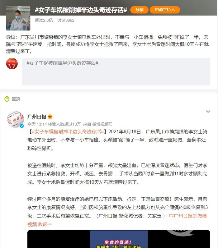 12月7日上午,#女子车祸被削掉半边头奇迹存活#上了热搜,引发了2.8亿阅读和3862次讨论。