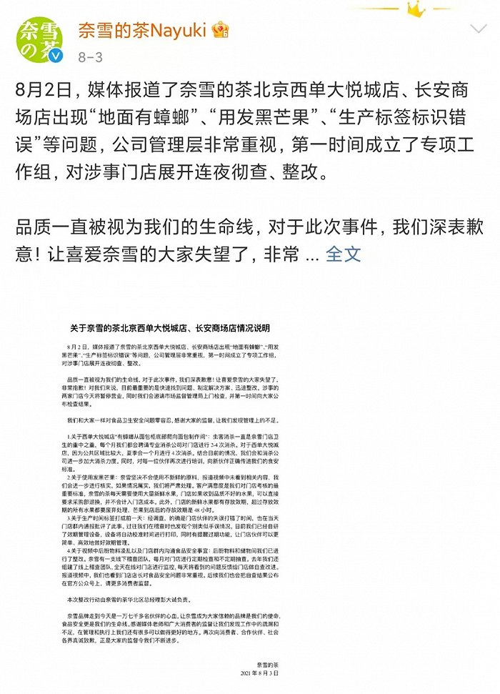 以被称为“新式茶饮第一股”奈雪的茶为例,从年初至今,奈雪的茶已经被爆出多起食安问题,其中包括产品过期、产品菌落含量超标、水果腐烂等问题。据统计,8月份北京市市场监管部门、广东省市场监管部门全面排查了辖区内奈雪的茶及类似门店1811家,其中责令整改的店铺50家,警告2家,立案查处的竟达到23件。奈雪的茶一度因食安问题被推到舆论的风口浪尖上。