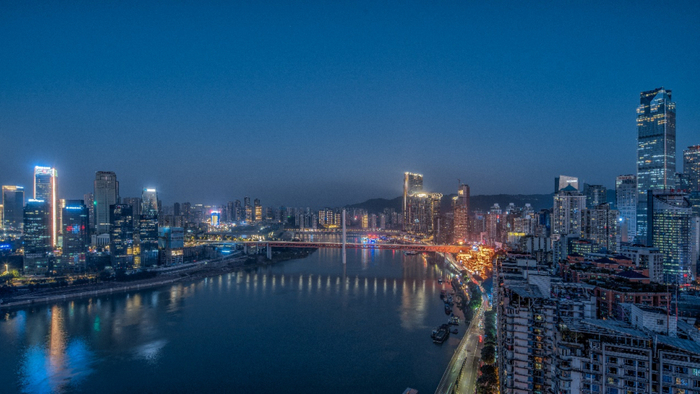 可以把来福士广场、江北嘴、洪崖洞统统收入窗前,近处摩天大楼霓虹闪烁,过江大桥上车水马龙,远处山上的绿茵和城市的地标都尽收眼底,堪称总裁视角,仿佛一座城市就在脚下。