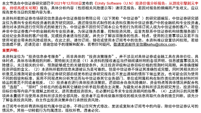 作为全球领先的游戏引擎厂商,Unity持续受益于全球移动游戏产业和在线广告市场的高成长性。考虑到公司在全球游戏引擎市场领先地位,我们判断公司游戏相关业务未来三年有望保持20%以上增速,同时IDFA亦长期利好于公司广告业务的表现。而随着汽车、建筑、媒体,以及未来元宇宙等领域对3D引擎需求的持续增长,公司业务有望逐步从游戏渗透至其他领域,并打开更大的增长空间。短期而言,公司仍需进行大量研发投入,盈利尚需时日,同时考虑到近期市场对美股宏观流动性收紧的担忧,作为高估值、高成长类公司典型代表,公司短期股价波幅亦可能明显加大。长期而言,我们持续看好公司在3D引擎领域的竞争优势,以及长周期投资价值。