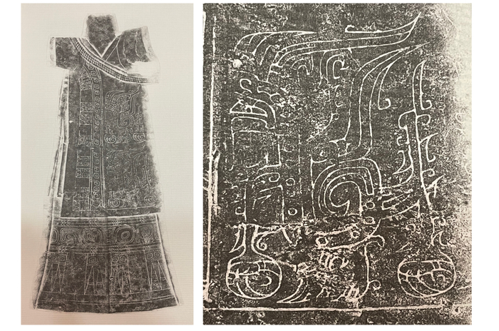 三星堆二号坑出土的青铜高台立人像,服饰繁纹满饰,纹样构图对称工整,应为在丝绸面料上刺绣或印绘所成。其中最外层礼服饰有四龙,龙纹两两相背,龙首上昂,龙爪紧握为拳,龙翅高展。龙首向上的卷龙即衮,饰有衮的礼服即王者之服衮衣。《说文》云:“衮,天子享先王。”《周礼·司服》也说“王之吉服,享先王则衮冕”。立人像身着衮衣,具有王者身份,立于高台之上,手握神器,又具有巫者身份。这尊仿真人大小铸造的立像,应是描摹一位身着“衮衣绣裳”丝绸华服的领袖主持隆重祭典的场景。