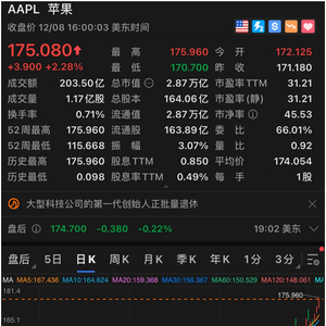 12月8日,苹果公司收盘报175.08美元/股,涨幅为2.28%。苹果公司只需要上涨6%,就能成为首家市值超3万亿美元的公司,而这距离它首次超过万亿市值还不到四年。