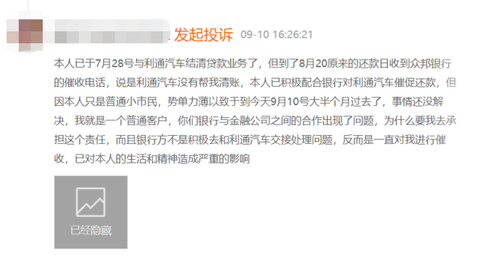 在李华的多番投诉及强烈要求下,直至8月,众邦银行表示与利通汽车已完成交接,才停止对李华的催收。然而,还有更多用户表示,自己还款成功后,目前仍被众邦银行催收。