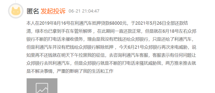 *用户投诉利通汽车及众邦银行,截图自黑猫投诉